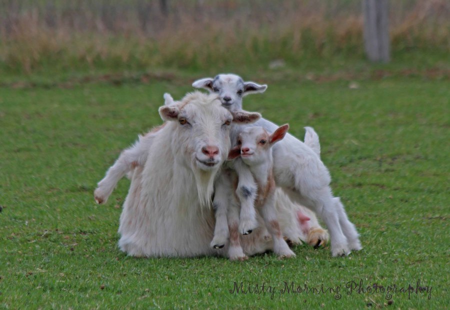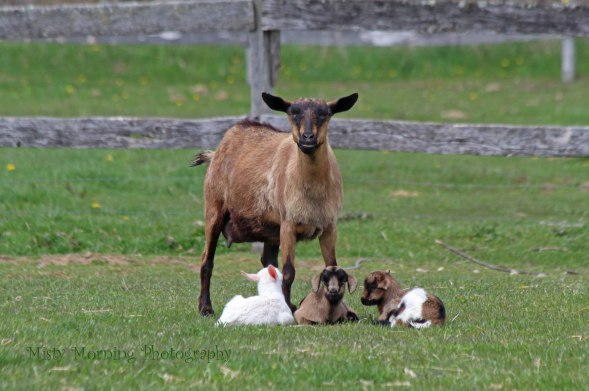 This is Marshmello. She was my first purchase, along with her twin sister Carmello, when I got into fainting goats. Neither Marshmello or Carmello had kids last year but Marshmello 'adopted' her daughter, Lulu's first kids last spring. Grandma was always on duty when mom took a break. She is pictured her with a set of her triplets from years ago.